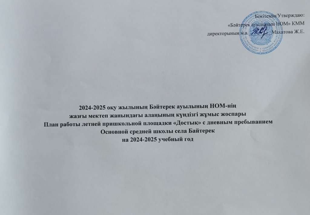 2024-2025 оқу жылының Бәйтерек ауылының негізгі орта мектебінің жазғы мектеп жанындағы алаңының күндізгі жұмыс жоспары