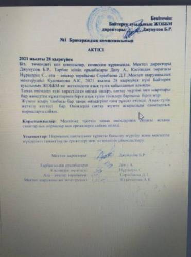 Тамақтану жөніндегі бракераж комиссиясының мектеп асханасын тексеру актісі.