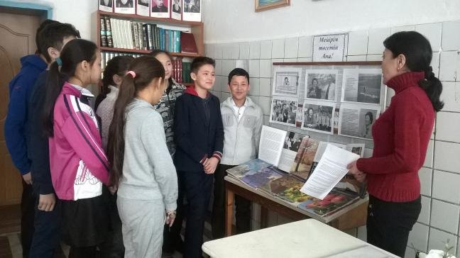 Сегодня 4 февраля 2017 года в Байтерекской библиотке была проведена книжная выставка среди учащихся 7-8 классов посвященная по предмету самопознания на тему "Мейірім төгетін Ана!" библиотекарь Байтерекской ОШ Тандаева К.К.