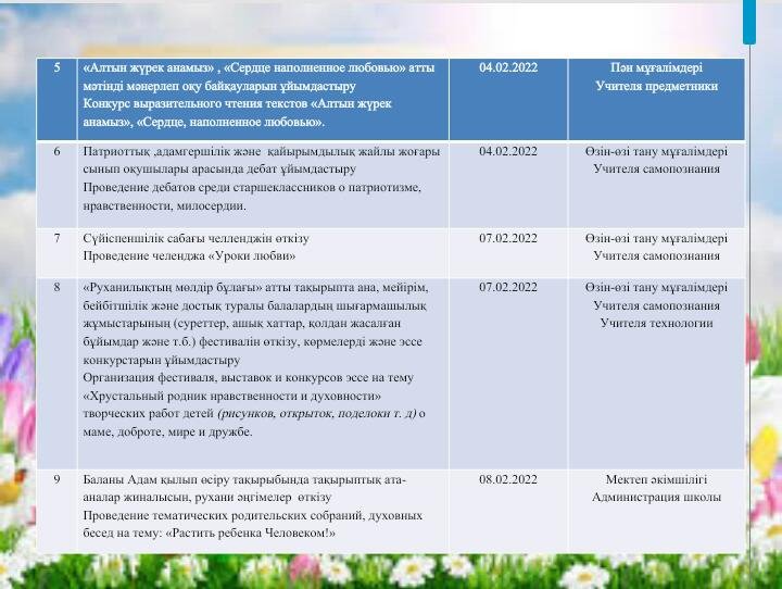2022 жылғы 1-11 ақпан аралығында "Өзін-өзі тану: Махаббат пен шығармашылық педагогикасы" онкүндігін өткізу жоспары.