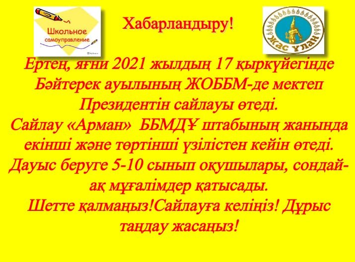 Ертең, яғни 2021 жылдың 17 қыркүйегінде Бәйтерек ауылының ЖОББМ-де мектеп Президентін сайлауы өтеді.